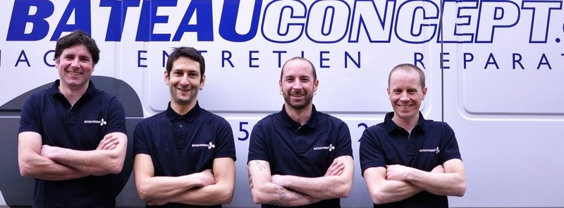 "Bateau Concept, c'est une équipe de 4 passionnés qui connaissent parfaitement les clients et leurs bateaux. Gaël va être plutôt menuiserie, stratification, peinture et voile, Olivier s'occupe de l'administration, du magasin d'accastillage et des pièces détachées, Guillaume est davantage sur la mécanique et je m'occupe surtout de l'électricité, de la chaudronnerie, des chantiers industriels et des bateliers. Chacun de nous est autonome et les clients le savent" explique Joseph Mitton. Pour compléter ces corps de métier, "Bateau Concept" fait appel à des sous-traitants qu'il connaît bien, sableur, sellier, climatiseur ou plombier-chauffagiste. Enfin, l'entreprise dispose d'un système de Parklev pour lever les bateaux jusqu'à 15 t.