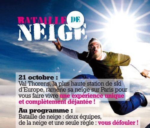 Demain, mercredi 21 octobre : bataille géante de boules de neige sur la péniche "Le Bateau" entre le pont Louis Philippe et la passerelle des Arts à Paris. Le rendez-vous est fixé à partir de 15h par la station de sports d'hiver la plus haute d'Europe, Val Thorens (2 300 m). L'Office du Tourisme de Val Thorens organise cet événement pour le lancement de la saison hivernale dans un mois jours pour jours. ....