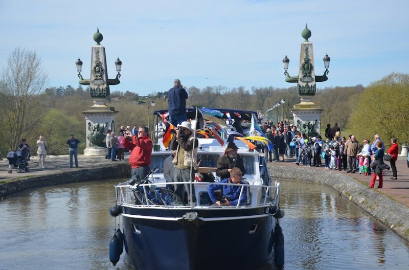 Le train de bateaux a quitté Saint-Firmin-sur-Loire en milieu de matinée pour s'engager sur le pont-canal. Derrière "La Poule d'eau" - le bateau de la capitaine du port de Briare, Dorothé Maas - suivait une longue flotte de bateaux pavoisés dont les équipages réjouis haranguaient la foule. Participaient aussi au cortège, bon nombre de bateaux des bases de location toutes proches (Locaboat, Charmes Nautiques, Le Boat et Nicols), les pédalos géants des "Engincroyables", et les "Bateaux touristiques de Briare" avec leur toute nouvelle gabarre "Vent de Galerne". Enfin, le "Vulcania" - dont le port d'attache se trouve habituellement en Suisse, sur le lac Léman - a fait sensation. Inspiré des bateaux du Mississipi, le bateau est mû par une machine à vapeur de 1906 qui alimente également un "calliope", un très sonore orgue à vapeur.