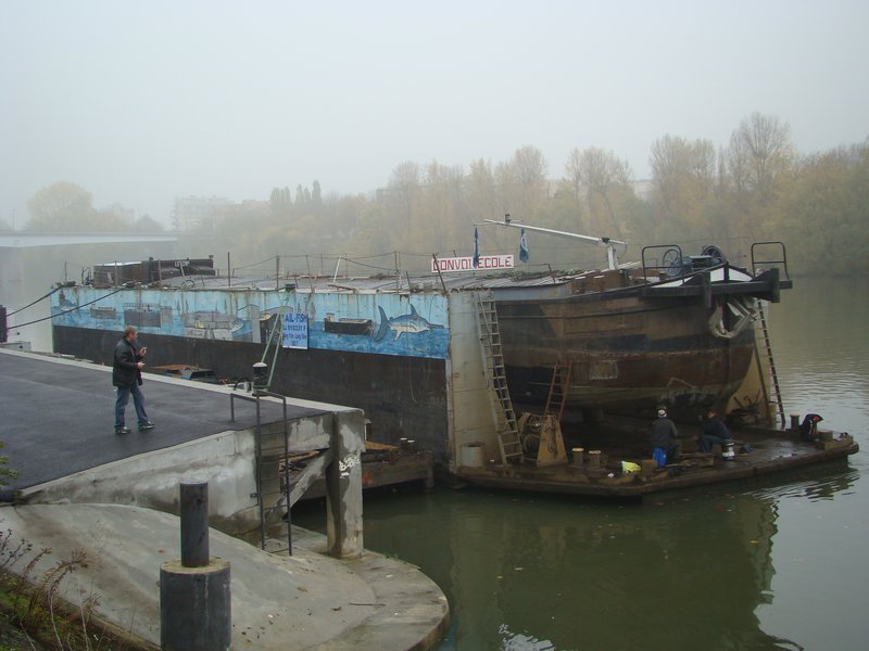 "Le Cap", pousseur de 38m et convoi-école du CFANI (Centre de Formation d'Apprentis de la Navigation Intérieure) du Tremblay-sur-Mauldre (78), en cours de carénage à Bougival, sur le dock flottant de l'entreprise CHL.