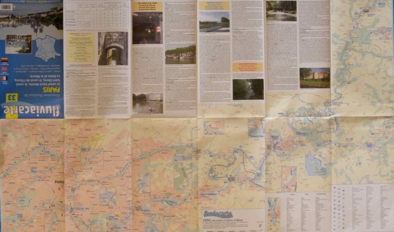 La grande carte (98cm x 59cm - pliage accordéon) des voies d'eau parisiennes vient de paraitre. Très précise, cette Fluviacarte n°33, à l'échelle 75.000e, regroupe les trois canaux de Paris - le canal de l'Ourcq, le canal Saint Martin et le canal Saint Denis - ainsi que la Seine de Bezons à Charenton et la Marne jusqu'à Courtaron. Y sont indiqués la longueur (les points kilométriques) de chaque voie navigable, les tirants d'air et d'eau, les gabarits des écluses et des tunnels, les horaires et fonctionnements des écluses, et les services de proximité. Un petit texte touristique illustré présente chaque voie d'eau et rappelle son histoire... ....