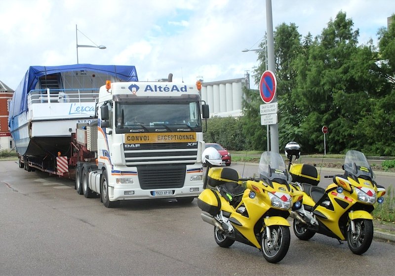 En France, les convois routiers larges de plus de 4 m, longs de plus de 25 m ou d'un poids supérieur à 72 t, doivent être accompagnés par deux voitures, une devant et une derrière, et deux véhicules légers de guidage, généralement des motos. Les convois qui ont transporté, en juillet 2014, le "Charlemagne" de Royan à Givet et, en août 2015, l'"Escapade" de Saint-Nazaire à Longueil-Sainte-Marie étaient tous deux longs de 40 m et larges de plus de 5 m. Jean-Michel Testard et l'un de ses cinq employés motards faisaient donc partie de l'escorte avec leurs puissantes motos jaunes. "Notre rôle est de faciliter la progression du convoi, dans le strict respect du code de la route, et d'assurer la sécurité des usagers qui n'ont souvent pas idée de ce qu'est un tel convoi et de sa difficulté à manœuvrer" explique Jean-Michel. Plus maniables qu'une voiture, les motos permettent de fermer les routes latérales à l'avant du convoi ou d'assurer une "bulle de sécurité" à l'arrière.
