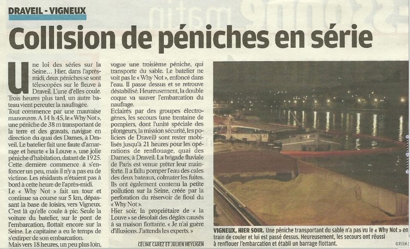Dans son édition spéciale "Essonne" de samedi, "Le Parisien" rapporte la chronologie des évènements. Vendredi après-midi, le "Why-Not" qui circulait en convoi, aurait percuté "La Louve", en amont du port aux cerises, avant de couler 5 km plus loin devant l'écluse d'Ablon. Puis, dans la soirée, un chargé, ignorant du drame, passe sur l'épave et doit à sa double coque d'éviter à son tour le naufrage...