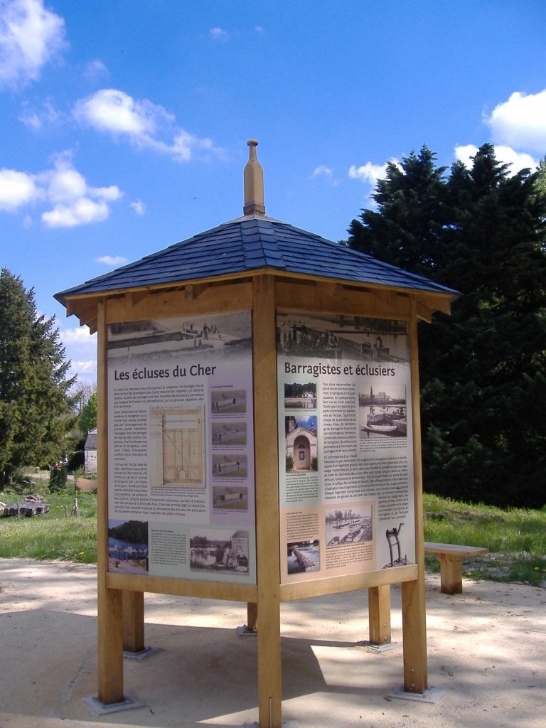 Quant au nouveau "sentier de découverte" (*) : au départ de la rue des Mariniers, dans le hameau de Chandon, à Athée-sur-Cher, il suit le chemin de halage du Cher, passe devant le barrage à aiguilles de Nitray - protégé, faut-il le rappeler, au titre des monuments historiques - avant de parcourir bois et prairies pour revenir à son point de départ. Deux kiosques, l'un à Chandon, l'autre devant le barrage, racontent l'histoire du Cher canalisé, les métiers de la voie d'eau ou le fonctionnement du barrage et de son écluse. Ils sont complétés par dix bornes (**) qui présentent chacune un type de bateau (gabarre, sapine, bateau-lavoir...).