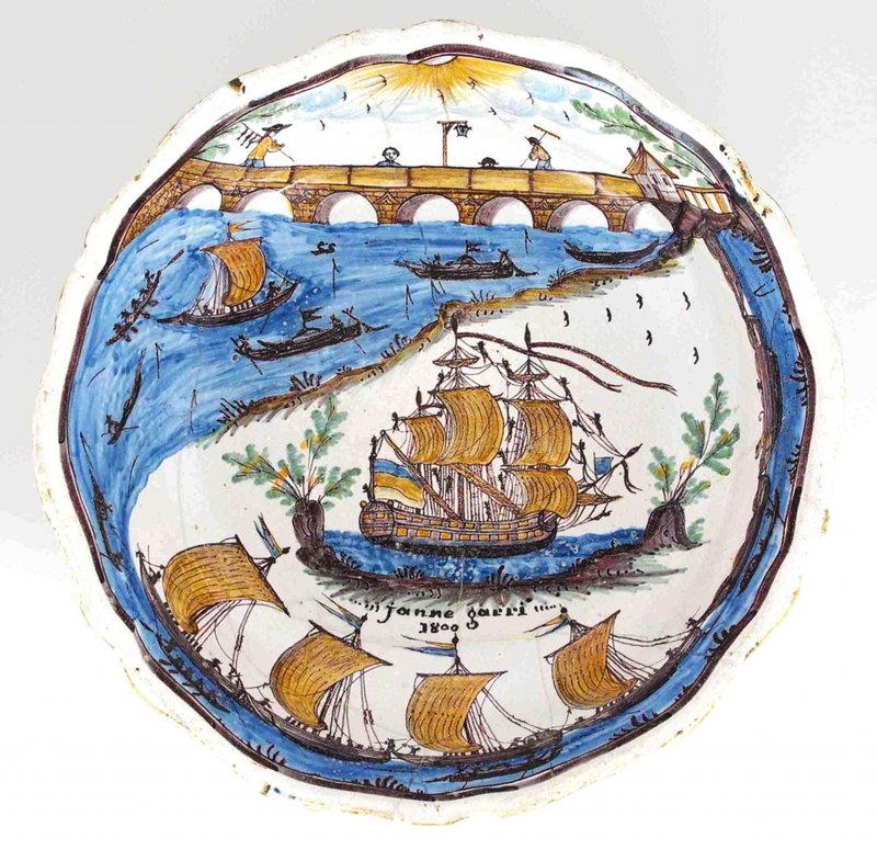 La faim, la maladie et les batailles auront raison de nombre des mariniers de Loire, mais aussi pêcheurs ou cordiers, incorporés dans la "Royale", la marine du roi, puis, après 1789, sur les bateaux de la République et de l’Empire. Ceux qui revenaient, lourds de souvenirs, commandaient parfois aux faïenciers des plats qui associent bateaux de guerre et trains de gabarres sous le pont de Nevers. L'exposition présente un de ces plats auprès d'ex-votos et de girouettes "marines". Pourvoyeuse d'hommes, la Loire fournissait également les arsenaux de Brest et de Rochefort en matériaux : chanvre d'Anjou, pin d'Auvergne ou ancres venues des forges nivernaises.