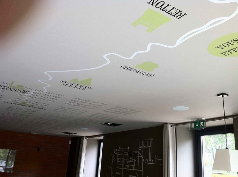 Une bonne idée pour les voyageurs du fleuve, et pour déjeuner à portée de bateaux dans une ambiance tout à fait fluviale. Au plafond de la salle du restaurant : une carte du canal d'Ille-et-Rance et de ses haltes (avec les églises dont les clochers servent de repères aux mariniers). Au mur : une coupe shématique légendée du poste arrière d'une péniche. Et, à l'extérieur ? : des hublots bien sûr !