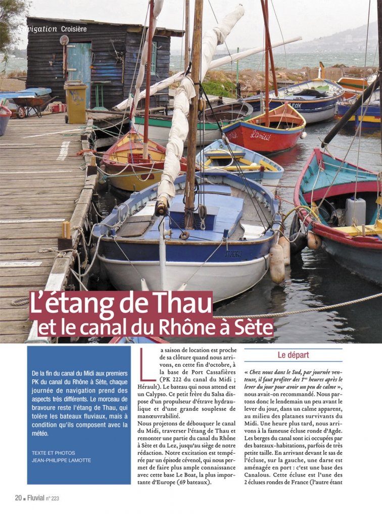 > Une croisière au travers tout l'Étang de Thau. Des derniers kilomètres du canal du Midi aux premiers PK du canal du Rhône à Sète. Chaque journée de navigation prend des aspects très différents. Le morceau de bravoure reste ce grand étang de 7.500 hectares, aux allures de mer intérieure. Il ne tolère les bateaux fluviaux qu'à la condition qu'ils composent avec la météo (interdiction de naviguer au-dessus de force 3)