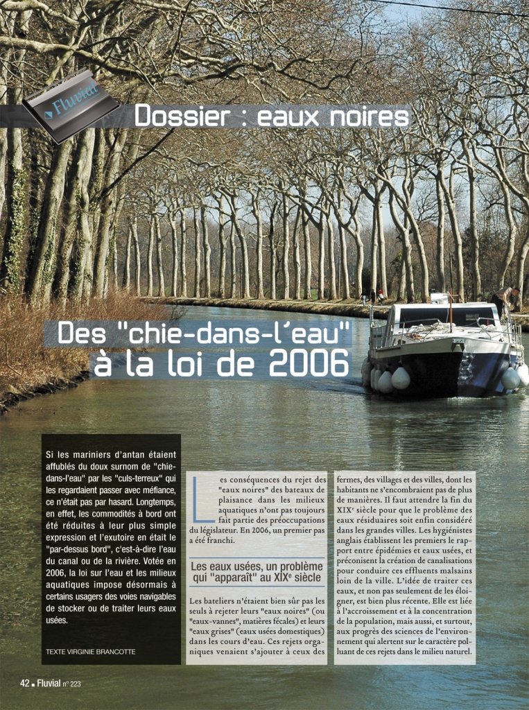 - - Des "chie-dans-l'eau" à la loi de 2006. Si les mariniers d’antan étaient affublés de ce peu aimable surnom, c'est que pendant longtemps les commodités à bord avaient été réduites à leur plus simple expression. L’exutoire naturel était le "par-dessus bord". Votée en 2006, la loi sur l’eau et les milieux aquatiques impose désormais aux usagers des voies navigables de stocker ou de traiter leurs eaux usées...