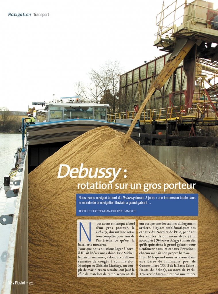 => Sur la Seine en cargo. Jean-Philippe Lamotte a embarqué sur le "Debussy" un bateau moderne de 86 mètres propulsé par un V12 de 1.200 CV. Une immersion de 3 jours dans le monde de la navigation fluviale à grand gabarit. 110 m2 habitables et 2.300 m3 de cale. Le macaron, pièce maîtresse de la timonerie, a disparu, remplacé par des joysticks, des ordinateurs et des écrans de contrôle...