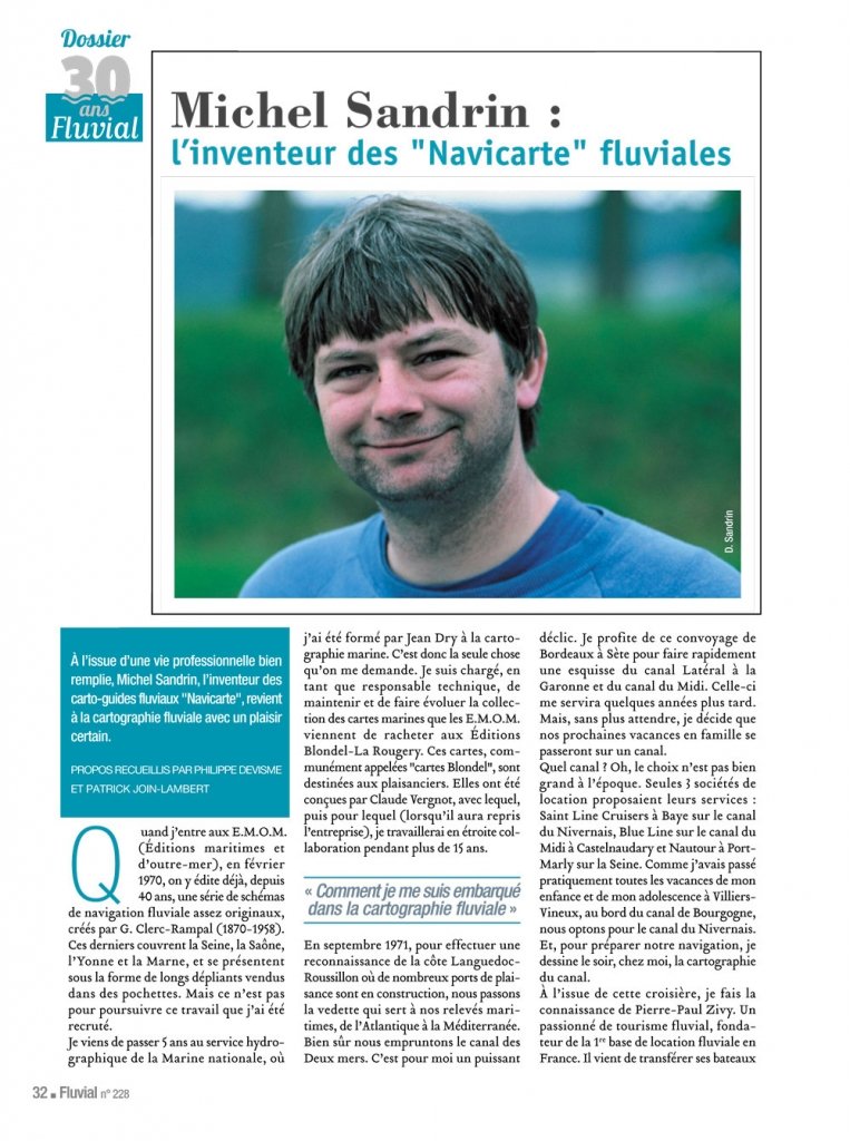=> L’inventeur des "Navicarte" fluviales. Michel Sandrin a créé, dans les années 70, la cartographie de navigation fluviale en mariant intimement des schémas de voies d'eau élargies et légendées à des fonds de carte de l'IGN au 25 ou au 50.000ème. Avant lui, les navigateurs ne disposaient que de schémas de navigation sans environnement cartographique, ou de profils en long des voies navigables sans grande utilité pour la navigation.