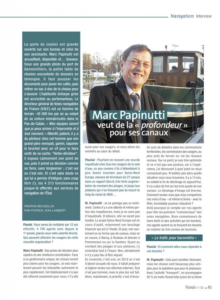 => "Mais où vont les "Voies navigables de France" ? - Le directeur général de VNF, Marc Papinutti répond à FLUVIAL et se veut rassurant : les Canaux ? "on ne les ferme pas, on en rouvre" ; les transferts aux régions ? "des conventions, à défaut de cessions" ; les platanes du canal du Midi ? "on les abat, mais on replante" ; la vignette ? "plus chère, mais les excès seront gommés (NDLR : pas plus de 30%, mais 30% quand même...) et le service amélioré"...