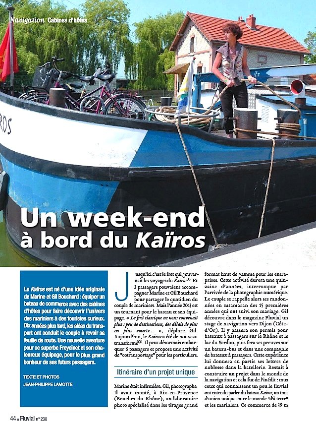 => Puis on embarque pour un week end sur le Kaïros - Un bateau né d’une idée originale de Marine et Gil Bouchard : équiper un "commerce" avec des cabines d’hôtes pour faire découvrir l’univers des mariniers à des touristes curieux. Dix années plus tard, les aléas du transport ont conduit le couple à revoir sa feuille de route, et à diminuer le volume de sa cale pour augmenter le nombre de ses cabines...