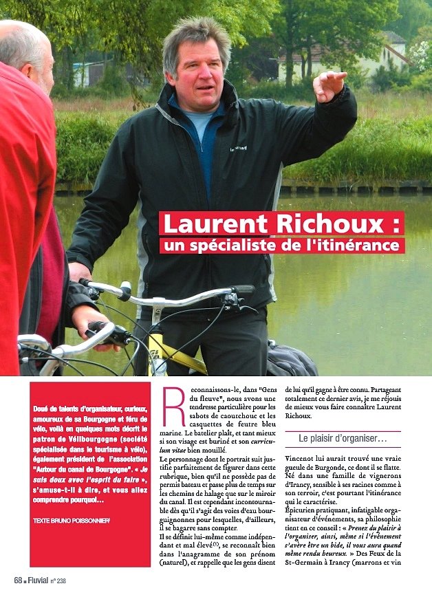 => Et c'est en vélo qu'on termine ces randonnées, avec Laurent Richoux : un spécialiste de l'itinérance - Doué de talents d’organisateur, curieux, amoureux de sa Bourgogne et féru de vélo, voilà en quelques mots décrit le patron de Vélibourgogne (société spécialisée dans le tourisme à vélo), également président de l’association "Autour du canal de Bourgogne". « Je suis doux avec l'esprit du faire », s’amuse-t-il à dire, et vous allez comprendre pourquoi…