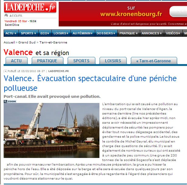 Après 9 jours d'attente, le 2 mars dernier, un "bateau pollueur" a enfin été évacué du port-canal de Valence d'Agen (Canal de Garonne, PK 81). Le propriétaire, mis en demeure par la mairie d'évacuer son bateau, a fait intervenir une grue de 230 tonnes... ....