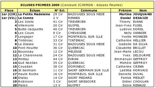 Le premier prix "canal" a été remis à Martine Jouquand pour le fleurissement de son écluse de la Petite Madeleine (au PK43 de l'échelle de Hédé, à l'entrée de la halte nautique); le premier prix "rivière" a été attribué à l'écluse de Comte (PK1,8 de la Vilaine, à la sortie de Rennes), et à son éclusier, Daniel Desaize.