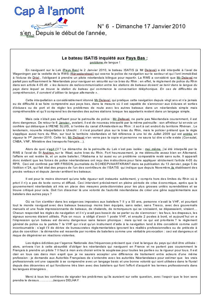 L'interpellation puis l'immobilisation à l'écluse de Driel de l'"Isatis", au prétexte que son patron ne parlait pas suffisamment le Néerlandais, puis l'obligation d'embarquer un pilote Hollandais pour être autorisé à repartir, ont mis en émoi la batellerie.
