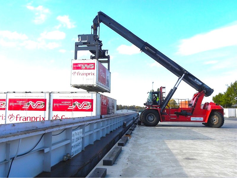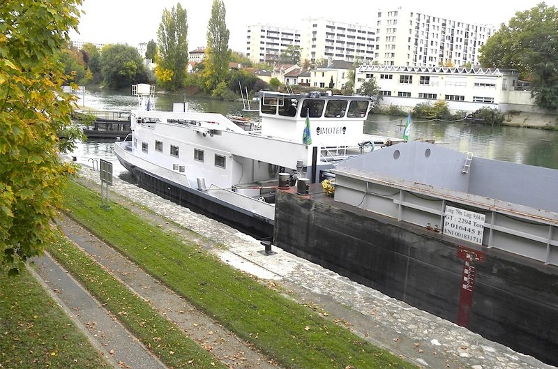 « Tiens, c’est Franprix qui passe…» - Chaque jour, sauf le week-end, la longue barge « Hamunaptra », poussée par « Imotep » (*) surgit de l’écluse de Créteil aux environs de 13h30. Dave, le batelier, rapporte 28 conteneurs vides au port de Bonneuil. En moins de 3 heures ils seront remplacés par 28 conteneurs transportant 400 à 500 palettes de produits alimentaires secs (conserves, biscuits, boissons…) destinés à une centaine de magasins Franprix dans Paris... ....