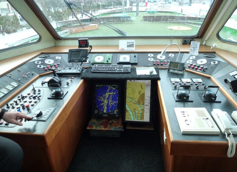 À la timonerie, le capitaine explique la conduite du bateau. La main sur le propulseur d'étrave, il précise qu'il est inutile de chercher le macaron : les trois moteurs de 600cv sont commandés séparément par les trois manettes noires, qui, en pivotant, font bouger les hélices pour le changement de cap. L’équipement est équivalent à celui des bateaux de commerce les plus modernes : deux grands écrans, ceux du radar et du GPS avec cartographie permettant de localiser les bateaux aux alentours, un transpondeur AIS donnant les paramètres de navigation, et de nombreux boutons et cadrans…