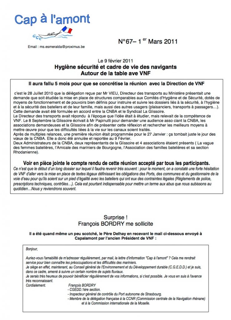 Dans le soixante septième numéro de son "Cap à l'amont", il dénonce "des blocages partout sur nos voies d'eau" et s'interroge : "Quelles sont les écluses qui fonctionnent sans problème en Seine ?". Puis il rapporte la liste impressionnante des carences constatées par les bateliers en matière d'hygiène et de sécurité : ... ....