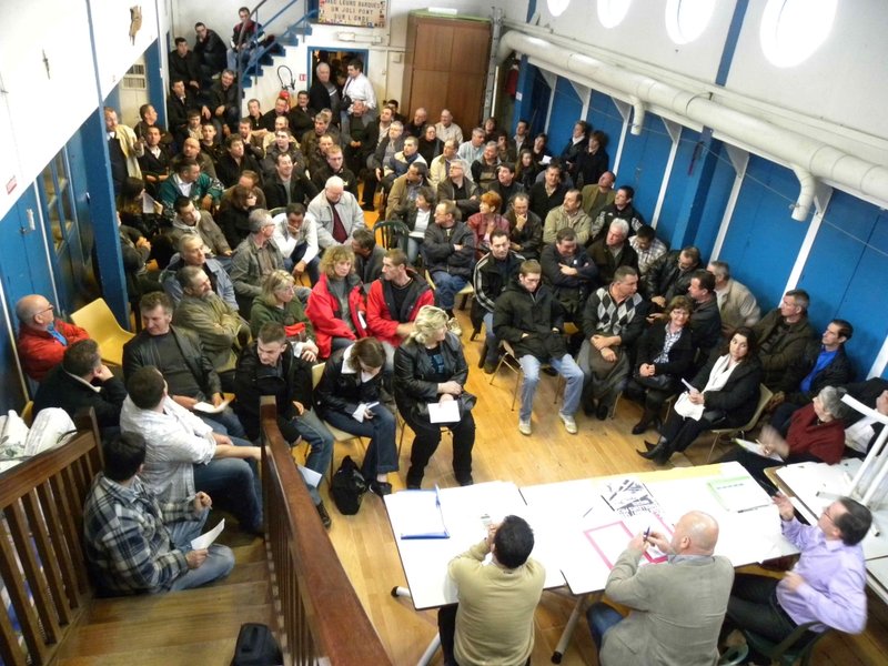 Le président de "La Glissoire", Daniel Claeys (bateau Calimero), était accompagné de Jacques Delhay (bateau Esmeralda). Il a lancé un vibrant appel à l'union et au rassemblement, puis soumis à l'assemblée des pistes de réflexion et d'actions. Concentrée, attentive, la salle a échangé calmement avec les deux leaders pendant deux heures et demi.