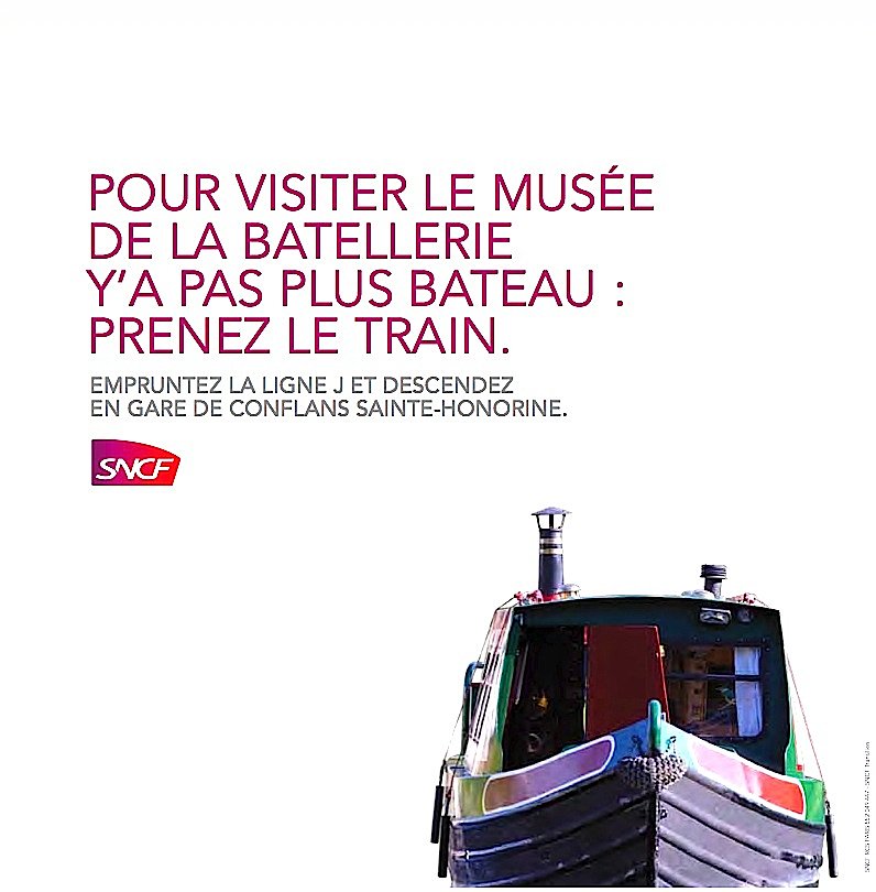 "Pour visiter le Musée de la Batellerie, y'a pas plus bateau : prenez le train. Empruntez la ligne J et descendez en gare de Conflans-Sainte-Honorine ".