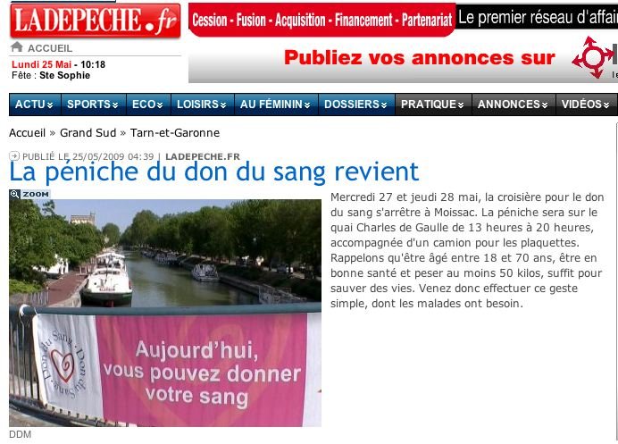 "La Dépêche du Midi" a suivi la péniche "Pays d'Oc" qui était, lundi, à Valence d'Agen. Elle sera demain, mercredi 27 mai, puis jeudi 28 mai, à Moissac le long du quai Charles de Gaulle, pour deux jours de collecte entre 13h et 20h.