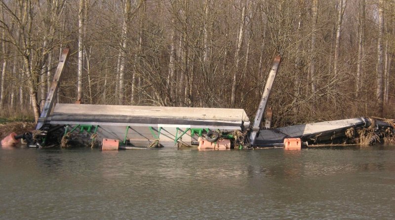 Cette machine est utilisée pour sucer la vase le long de la Charente. Elle a été arrachée puis retournée par les vents violents ou par l'importance de la crue, le 31 janvier. Et, elle s'est retrouvée les pattes en l'air, en face du ponton du village de Graves (PK 35,4).