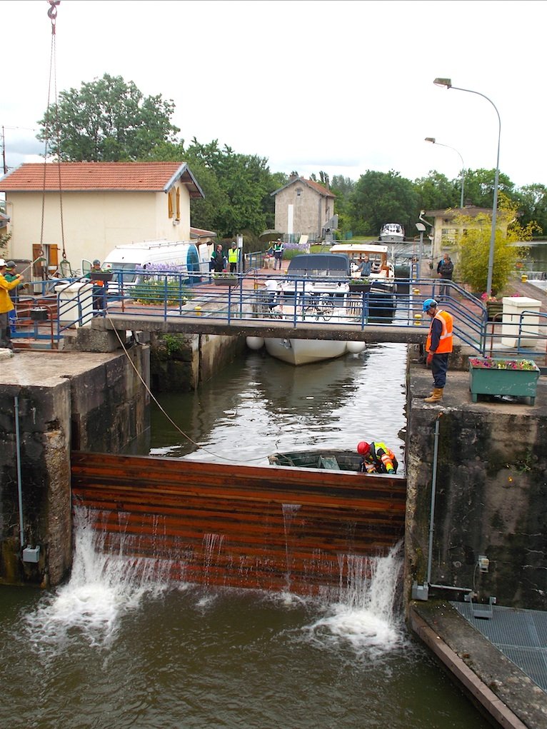À 13 h 25, le "Nobis" peut enfin reprendre la direction de Strasbourg. Aussitôt, deux des bateaux de plaisance amarrés à l’amont se glissent dans l’écluse, et l’on refait la manœuvre à l’envers : ôter les poutrelles une à une, 29 fois. Le niveau d’eau baisse lentement par les interstices, puis en cascade bouillonnante quand on enlève les poutres qui sont au ras de l’eau. Les 2 bateaux sortiront 2 h plus tard, à 15 h 25.