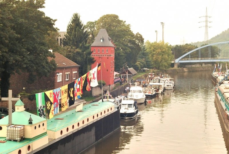 Le dernier week-end de septembre a embrasé la Sambre et pavoisé les bateaux du côté de Charleroi. C’était le 20ème Pardon de la batellerie à Marchienne au Pont. Un grand rassemblement autour du « Spes Nostra », l’un des tout derniers bateaux-chapelles de Belgique (*). Puisqu'un Pardon, c’est avant tout une messe et une bénédiction des bateaux. Et, bien entendu, un beau défilé nautique. Accessoirement une grande kermesse, avec ripaille et force boissons. De la musique, fanfares et chorales. Et une grande brocante sur les quais. ....