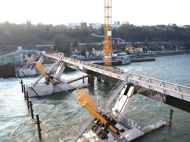 Après l’installation d’un premier batardeau, les travaux de génie civil pour la réalisation de la première passe navigable, de la passe à poissons et des appuis de la future passerelle ont été réalisés en 2010. En 2011, un nouveau batardeau a été mis en place pour la réalisation de la deuxième passe navigable et la pose de la passerelle piétonne. La fin des travaux est prévue pour mi-2012, après quoi la démolition de l’ancien barrage pourra commencer.