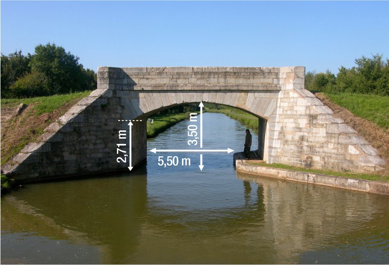 Le pont de Mougny, au PK62, et celui d'Anizy, au PK31, seraient les plus bas du parcours. Tout dépend donc de la hauteur et de la largeur de la timonerie, mais la plupart des bateaux de 3m à 3,10m de tirant d'air devraient pouvoir franchir ces ouvrages sans démarquiser, à condition de serrer au plus près le marchepied du pont. En revanche, aucun problème au nord du canal (versant Yonne), en deçà de 3,20m de tirant d'air. L'ouvrage le plus bas du secteur est le pont de chemin de fer des Dames, à l'amont de l'écluse, au PK150.