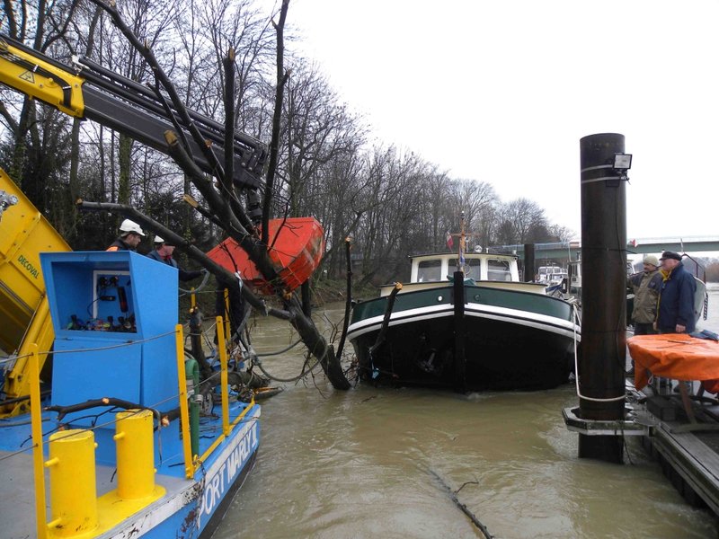 Il aura fallu trois heures à l'équipage du "Port Marly 2" pour extraire les deux arbres énormes et branchus, et dégager le port.