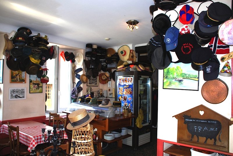 La nuit précédente, le "Vision Le Boat" avait couché à Ménétréol-sous-Sancerre (Cher), où nous avons pu faire un plein d‘eau ce matin. Il faut demander la clé au Floroine, le café face à la halte. C’est l’occasion d’admirer une des plus extraordinaires collections de couvre-chefs qui soit. Cette surprenante réunion est l’œuvre de Dominique Nowak, supportée par Véronique, son épouse. Cela fait 11 ans qu’ils sont installés ici, et la collection a une dizaine d’années d’existence. On y trouve quelques perles : une casquette à pont de marin russe, des képis de gendarmes, de gardes champêtres, de gardes-chasses, un képi d’officier de l’Assemblée nationale, des casquettes siglées S.N.C.F., E.D.F., et beaucoup d’autres joyeusetés qui envahissent les murs du café lentement, mais sûrement. On prend ainsi son noir et son croissant en imaginant les têtes de ceux qui étaient dessous tous ces chapeaux. Nous sommes partis le réservoir plein et la tête rêveuse...