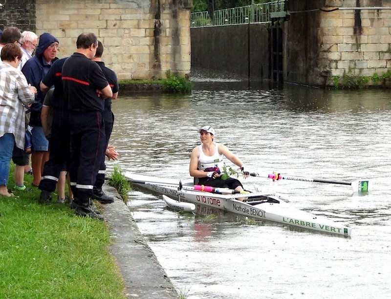 Justement, la voilà. Dans une minute, elle sera dans son bateau, jusqu’à la pause déjeuner. Il faut faire vite. Elle est concentrée, mais sourit quand même, plaisante, s’installe dans le skiff avec l’aide des pompiers. Pendant un moment, on ne la voit plus, sauf du haut du Vision, puis elle réapparaît à quelques mètres, ajuste ses avirons, et s’écarte des berges.