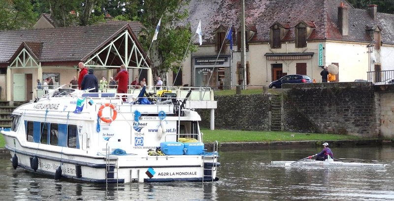 Aujourd’hui, en partant de Paray-le-Monial (Saône-et-Loire), nous avons pris à bord la journaliste d’un quotidien régional, dont le photographe nous a suivis en voiture. Il effectuait ses clichés depuis les ponts, les berges, les écluses, sans avoir hélas le plaisir de la balade. Nous avons fait une pause déjeuner en pleine nature, et avant de nous quitter, une dernière interview s’est déroulée à l’ombre des platanes. Ils s’en sont allés ensuite, marchant vers le prochain pont pour reprendre leur voiture. Nous sommes retournés dans notre voyage en solitaires. Car, même si le monde s’agite autour de nous, notre bulle se déplace sur l’eau avec cette difficulté de partager la vie que nous menons à bord, avec ses contraintes et ses impératifs, qu’ils soient humains ou publicitaires.
