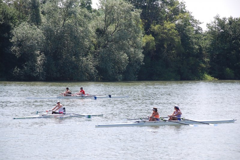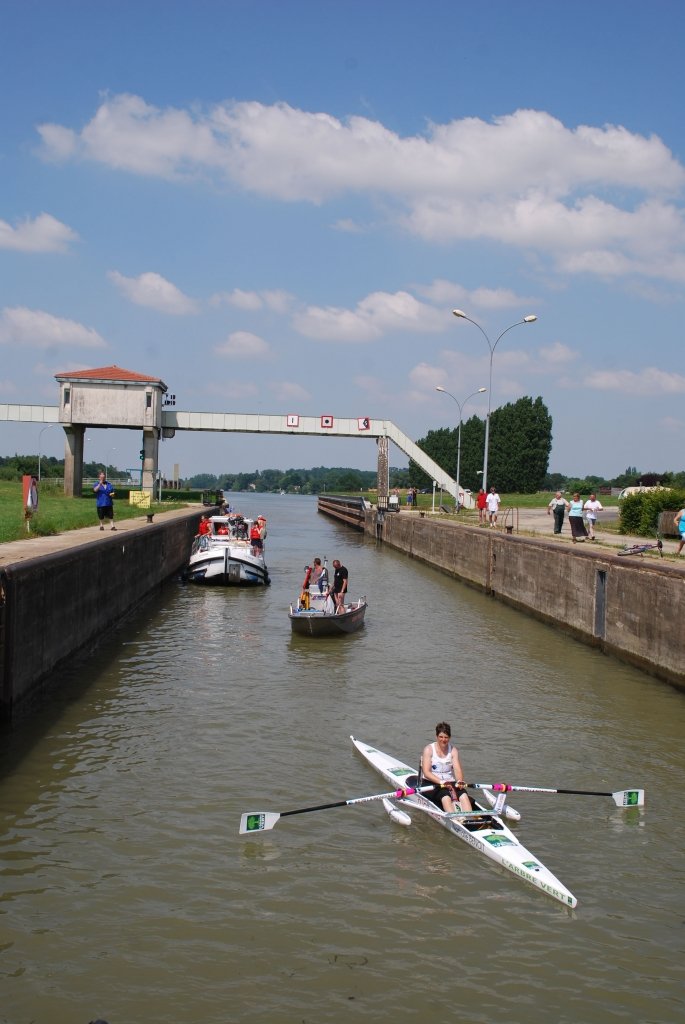 La sortie de Chalon-sur Saône (Saône-et-Loire), où nous avons passé la nuit, s’est faite groupée. Nathalie était accompagnée par 2 doubles et une Yolette (4 rameurs avec 2 avirons chacun, guidés par un barreur), l’un des engins les plus rapides qui soit à la rame. Tous les jeunes de ces bateaux venaient bien sûr du Cercle de l’aviron de Chalon-sur-Saône, où le skiff de Nathalie est resté après l’arrivée mémorable d’hier. ....