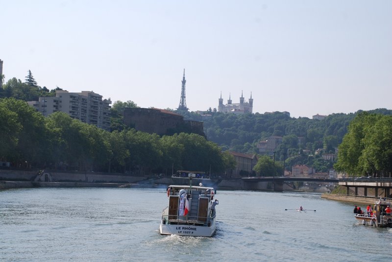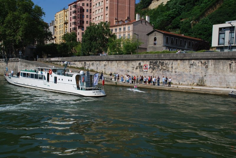 Ce matin, derniers coups de rame sur la Saône vers Lyon, à quelques kilomètres. Nous sommes escortés par « Le Rhône », la célèbre vedette de Voies navigable de France, qui porte haut les couleurs vert et bleu de l’établissement un peu partout en France.....