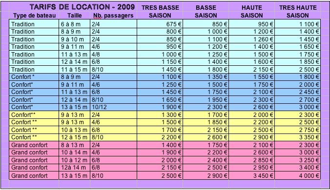 Moyennes de prix (+ ou - 15%) selon le type et la taille du bateau et selon la période de location. Les tarifs ne tiennent compte ni des éventuelles remises, ni du coût du carburant.