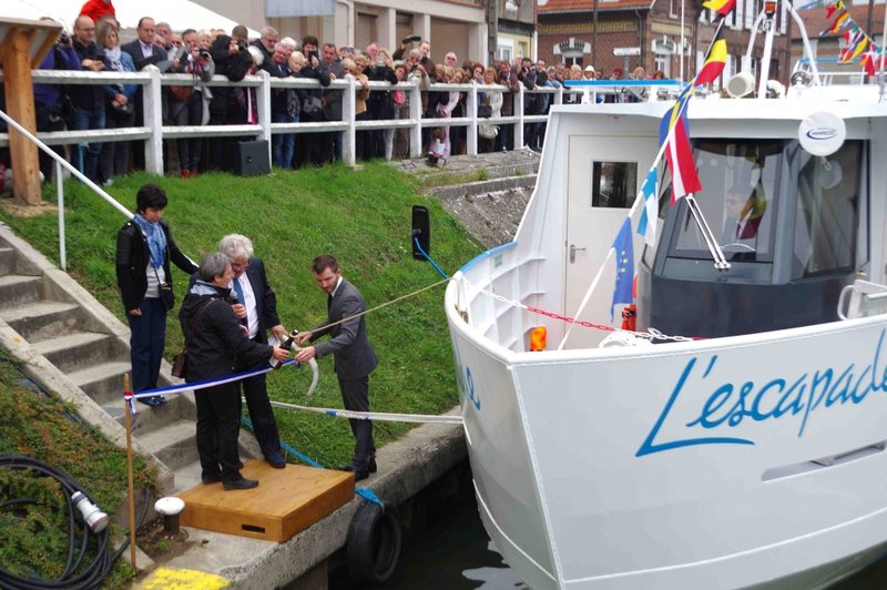 "Je nomme ce bateau l'Escapade. Je souhaite bon vent à son équipage et à tous ceux qui navigueront à son bord". Le samedi 10 octobre, la phrase rituelle a été prononcée par Patrice Carvalho, président de la CC2V et député-maire de Thourotte, tandis qu'Angela Oster, conseillère communautaire et marraine du bateau, baptisait la coque au champagne en présence de Ghyslain Chatel, sous-préfet de l’Oise, Daniel Beurdeley, vice-président du conseil régional de Picardie et maire de Longueil-Annel, Brigitte Lefebvre, présidente de Oise Tourisme, Marc Papinutti, directeur général de Voies navigables de France (VNF) et de nombreux élus des territoires des Deux Vallées, du Noyonnais et du Compiégnois. Le second parrain du bateau, Gérard Feldzer, victime d'un accident, n'avait pas pu participer à la cérémonie.
