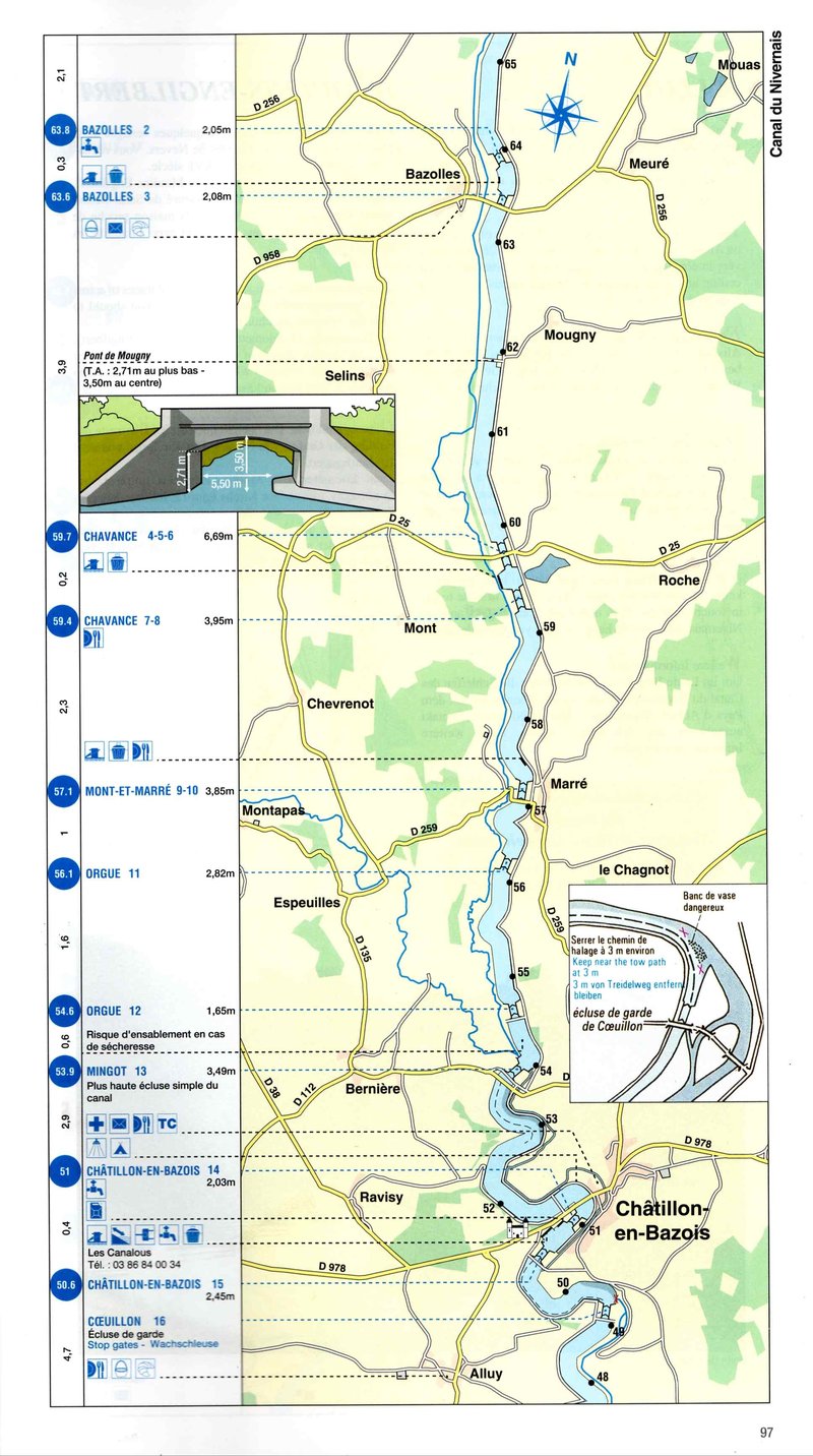La cartographie au 1 /50 000e et au 1 /25 000e donne toutes les informations utiles (mouillages, écluses, services, commerces, loisirs...). L’insertion de nouvelles photographies et la mise à jour des informations permettent de découvrir, tout au long du parcours les sites touristiques et bonnes adresses gastronomiques des villes et villages traversés, ce qui ne manque pas en Bourgogne !