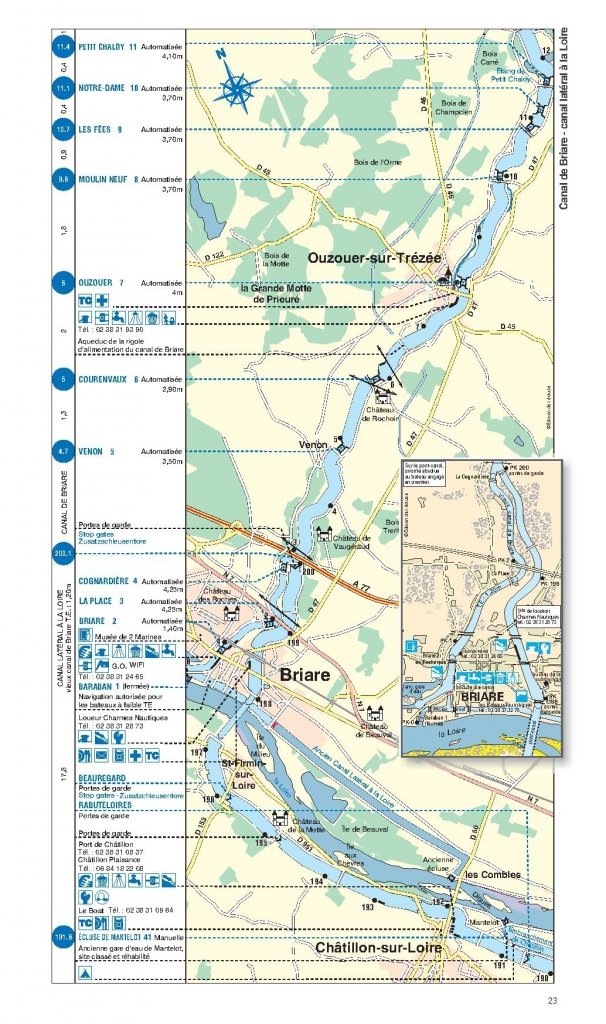Les coordonnées des services, le long et sur la voie d’eau, sont portées directement dans la marge. Des plans de Saint-Mammès, d’Auxerre et de Decize ainsi que les photos en couleur des ponts de Montereau à Auxerre complètent la cartographie.