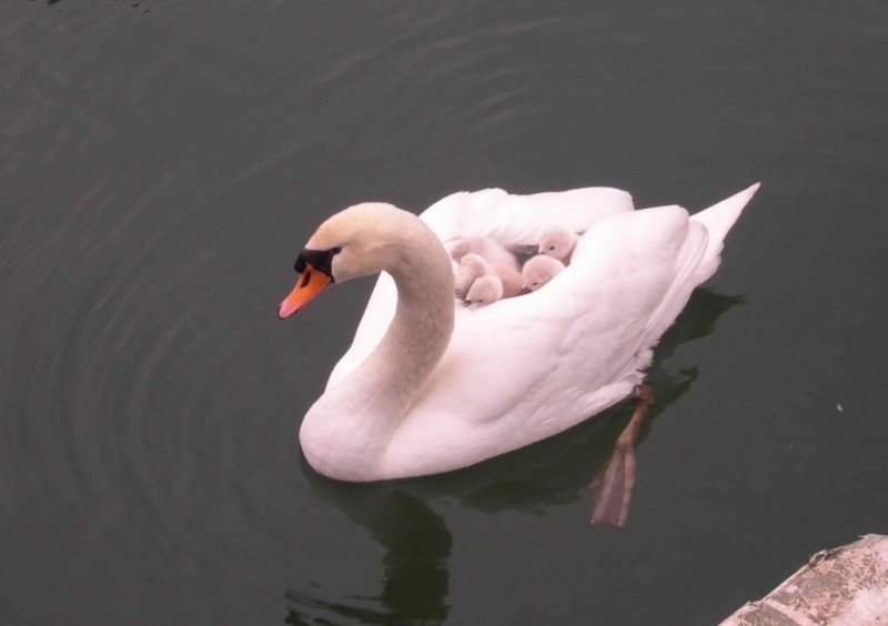 Dès leur premier jour, comme c'est la coutume chez les cygnes tuberculés, les cygnons ont commencé leur apprentissage de l'eau. Mais, pour des longues promenades, c'est plus chaud et plus confortable sur le dos de leur mère...