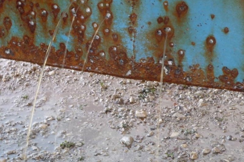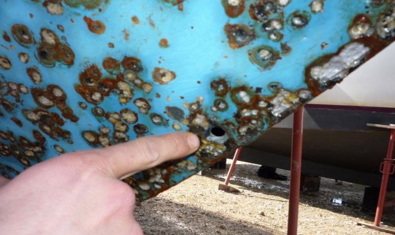 De l'eau s'échappe de la quille de l'"Alice", un des sept bateaux les plus touchés par cet invraisemblable accident d'électrolyse ("un éventuel problème de corrosion", selon Jean-Luc Soller !).