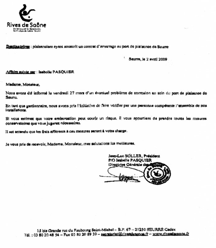 Les dernières photos parvenues à la rédaction de FLUVIAL font froid dans le dos. Quant à la lettre adressée aux plaisanciers, le 2 avril dernier, par le Président de la Communauté de Communes "Rives de Saône", Jean-Luc Soller, gestionnaire du port de Seurre, elle laisse sans voix ! Mais, à en croire les victimes, elle ne restera pas sans suites... ....