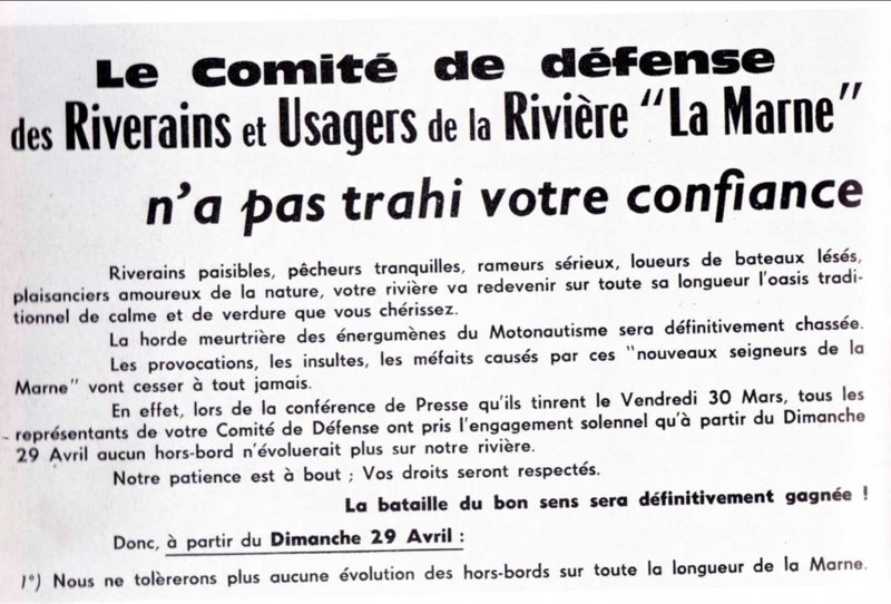 Tract distribué en 1962 pour interdire les hors-bords... (page 148 de l'excellent livre, malheureusement épuisé, de Michel Riousset : "de Lagny à Charenton. Les bords de Marne du Second Empire à nos jours").