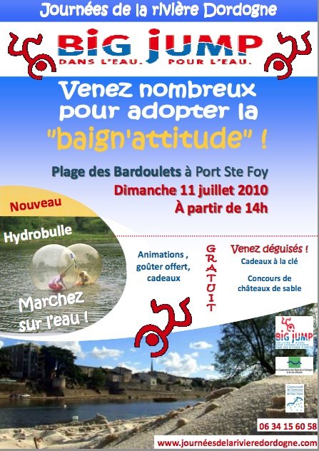À 15 heures, dimanche, des milliers d'européens vont simultanément sauter dans une rivière européenne afin de montrer leur soutien à la protection des cours d'eau et pour l'amélioration de la qualité de l'eau ! Plus de 130 évènements sont programmés dans toute l'Europe... ....Ainsi, à titre d'exemple, le Conservatoire des rives de la Dordogne, qui figure au nombre des promoteurs du "Big-Jump", donne rendez-vous sur la plage des Bardoulets à Port Ste Foy et Ponchapt pour promouvoir une rivière propre et vivante. À partir de 14h, des animations seront proposées avec notamment une activité inédite : marcher sur l'eau avec un "hydrobulle". Une expérience accessible dès 5 ans et sans limite d'âge !