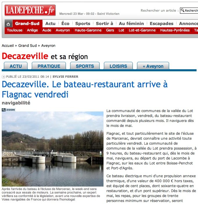 LA DÉPÊCHE => Le bateau-restaurant arrive à Flagnac vendredi