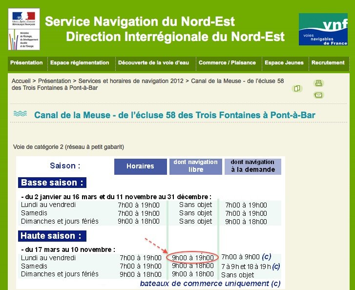 (*) NOTE => Vérification faite ce matin : le site Internet du Service de Navigation du Nord-Est n'a toujours pas corrigé ses horaires et indique encore une navigation libre, en semaine sur la Meuse, de 9h à 19h ...