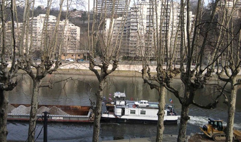 Les déblais sont transportés par camions vers la rive droite de la Saône, quai Arloing, puis chargés sur la barge "Apus" (82 m - 2.200 tonnes), au niveau du pont de Kœnig. Le pousseur "Europa", commandé par Gérard Gavelles, conduit la barge jusqu'au site de valorisation et de recyclage de Ternay sur le Rhône (PK 15), après avoir passé l’écluse de Pierre Bénite. Trois rotations sont effectuées chaque semaine, soit l’équivalent de 250 camions.