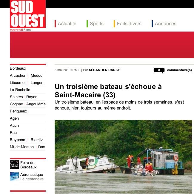 Trois bateaux échoués en moins de trois semaines, et au même endroit, ça finit par faire désordre ! Le journal "Sud-Ouest" qui relate le naufrage, rapporte que le subdivisionnaire de VNF a décidé de renforcer la signalétique de cet endroit dangereux en y implantant une grande balise cardinale. ....